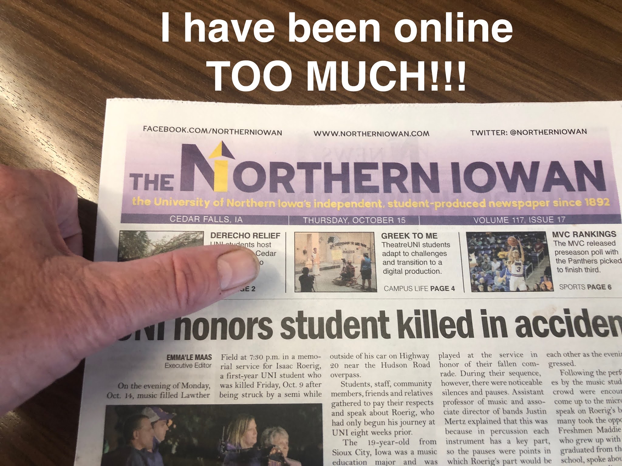 Just for a change, I donned my mask and walked across campus to the Union. I purchased a chocolate milk, picked up a Northern Iowan to read, walked outside, and sat on a concrete bench.