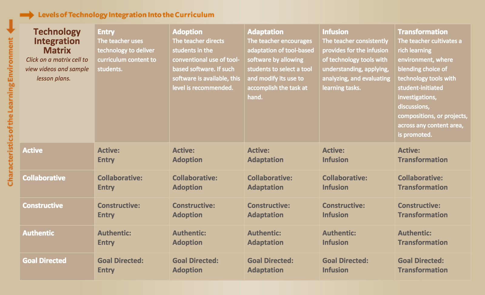 There are other important tools that provide vocabulary for using technology to engage learning.  There is the Technology Integration Matrix (TIM) which provides a system of 25 cells that have 5 columns headed with terms identifying the Levels of Tech Integration (complexity of technology use/level of student centricity) across the top and down the left side are 5 Characteristics of a Learning Environment.  The beauty of this matrix is that provides a system that you can use to identify where you are in a lesson/activity you are teaching and then suggestions for how you can increase your level of Technology Integration.  Both the Original Florida version and the Arizona versions have videos and lesson plans for creating these learning environments.  I have included a more complete description of these tools in another posting, Building Learning Through Technology. Based upon the TIM matrix, I would say that most of the previous chart’s activities in the left column involve Entry and Adoption while the right column describes Adaption, Infusion and Transformation.  What do you think?