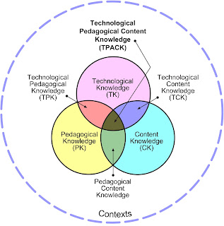 When you mention how we implement TPACK in our teaching, you touched on a topic that has been in the front of my mind for some time now. I think as we consider about how TPACK can be implemented in practice, we have to think also about how teacher TPACK can be developed. I think there are at least two levels of TPACK implementation we can consider with regards to level of technology use in the classroom: integration and innovation. We have been integrating technology for a long time using TPACK whether or not we really knew we were. I view integration as happening once we make a decision to use technology and include it in instruction. We make a decision about a technology, which then makes a change in how we teach the content, the P and C. However, if we think of TPACK as a knowledge to be developed in teachers, I think we can reach technology innovation which is the creation of new types of learning experiences that wouldn't have been possible without the technology. I believe there is a continuum between these two lenses if you will that teachers move along as they develop an awareness of TPACK. As the they develop each domain of knowledge: T, P, C, T, TP, TC, PCK, and TPACK, they can begin to see stronger connections between each domain and how each can be leveraged in the classroom to create new learning experiences.